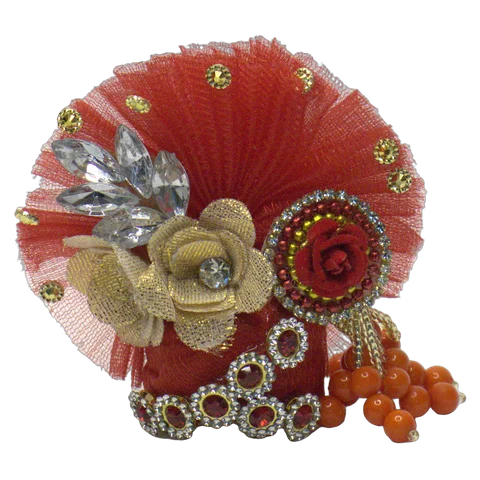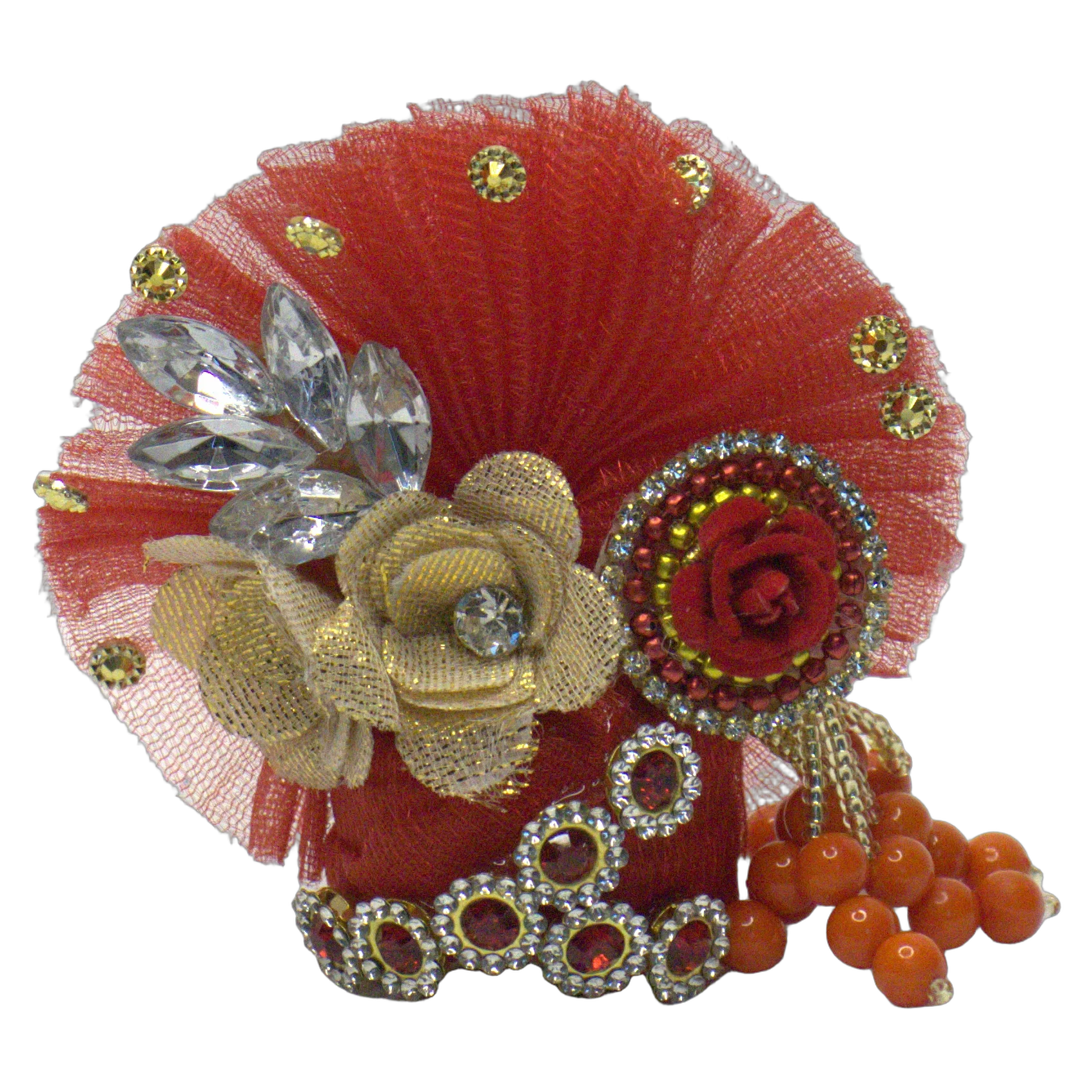 Red turban mukut with rose buttis, golden flowers, stone work and latkans