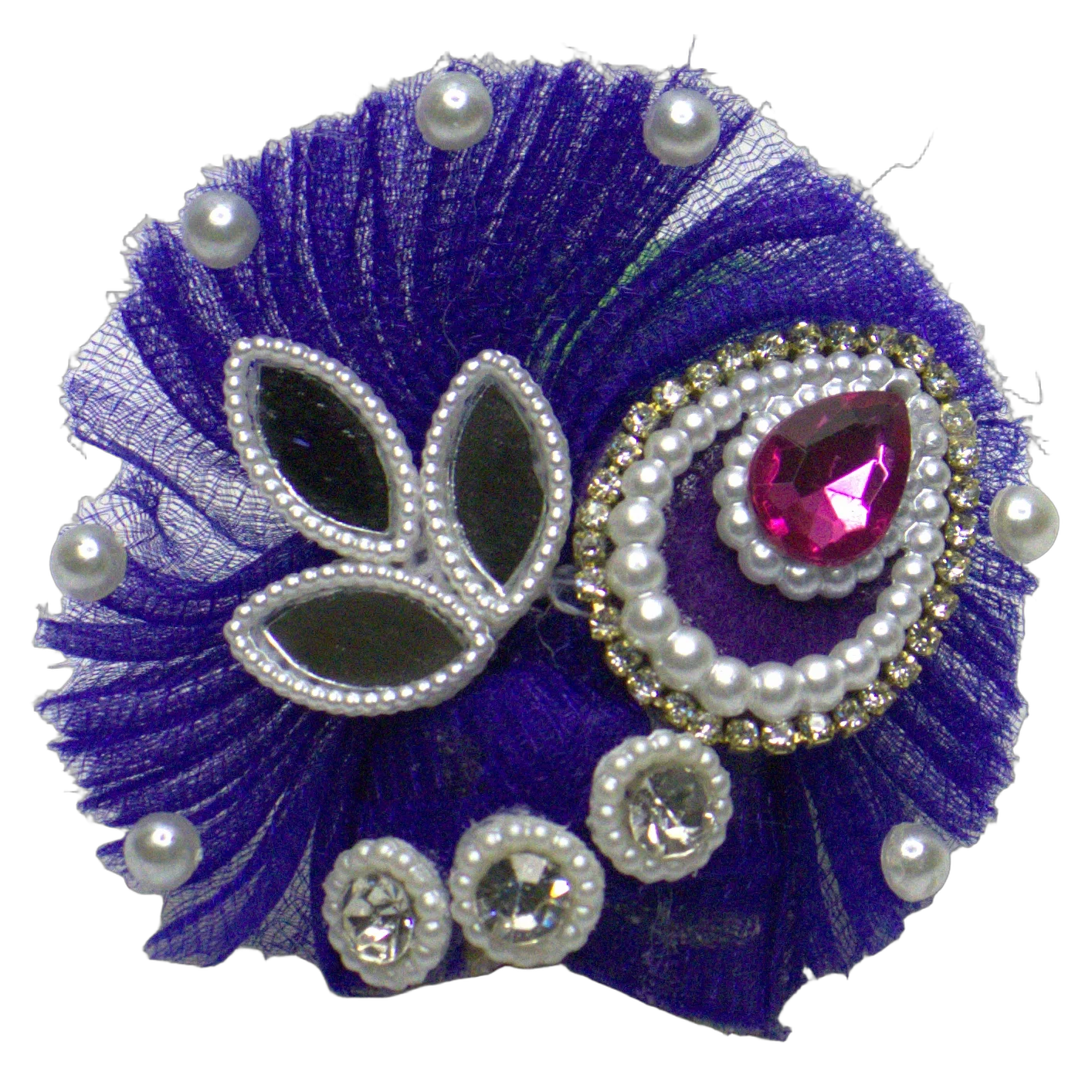 The matching mukut crown continues the same embellishment theme with pearl and mirror work. Designed to sit atop the idol, it frames the deity with coordinated detailing that ties the whole shringar together.