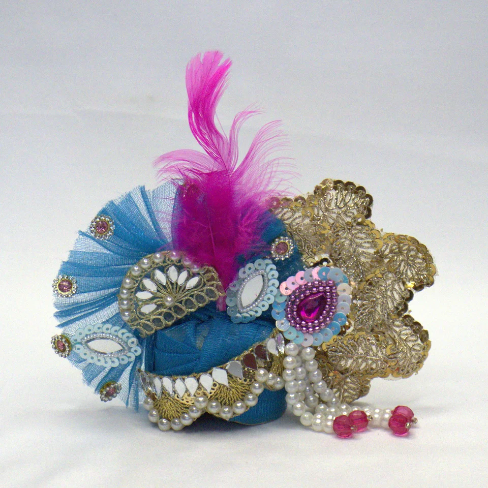 Mukut features golden lace, pearl and mirror butties, white and pink tassels, and a vivid pink feather for a royal look.