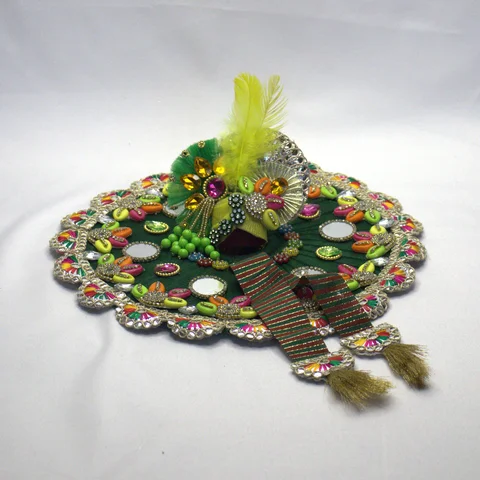 The green lace patka ties the whole set together with golden tassels that pick up the golden stones from the mukut. Every element from the dress border to the crown feather uses the same multicolor palette, creating a unified shringar that feels complete on Thakurji.