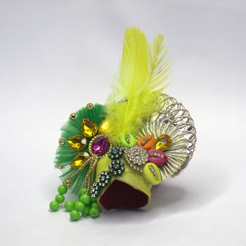 The mukut pairs perfectly with the dress. A yellow turban base with green frill creates a bold color contrast, while gota patches and golden stones add regal texture. The green buttons and matching shell butti echo the dress embellishments, and the yellow feather brings a vibrant finishing touch. A green bead tassel sways gently from the crown.