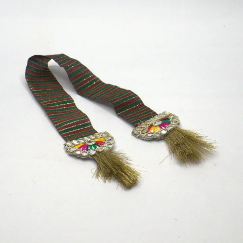 Green lace patka with golden tassels complements the dark green and multicolor palette of the set.
