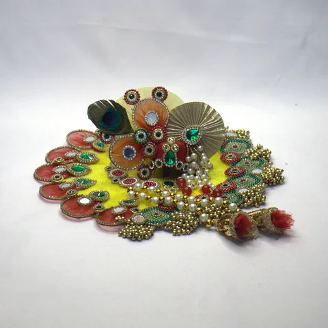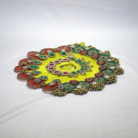 This lemon yellow net poshak brings a fresh, festive energy to Thakurji's shringar. The delicate net fabric catches light beautifully, while gold sequin butti work scattered across the dress creates a subtle shimmer. Intricate floral embroidery runs along the hem and neckline, adding handcrafted detail that mass-produced poshaks simply cannot match. The warm lemon tone pairs naturally with Krishna's peacock feather imagery. The matching mukut continues the floral motif with mirror butti accents that reflect candlelight during aarti. Pearl latkan hang from the mukut edges, adding life to the display. A fine zari border frames the mukut face, giving it a royal finish. The patka ties the whole look together with pearl beading meeting gold gota flowers and ball chain accents. When assembled, the lemon yellow dress, gold embellishments, and pearl details create a cohesive shringar palette. The net fabric is lightweight yet holds its shape, so the dress drapes properly on the idol without bunching or sagging. Sequin work is securely attached with reinforced stitching at stress points.