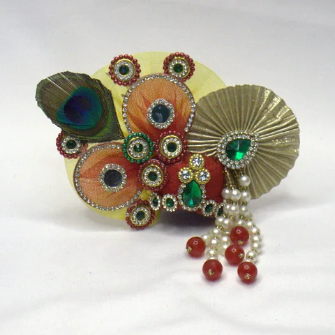 Matching mukut adorned with pearl latkan, mirror butti accents, and delicate zari detailing.