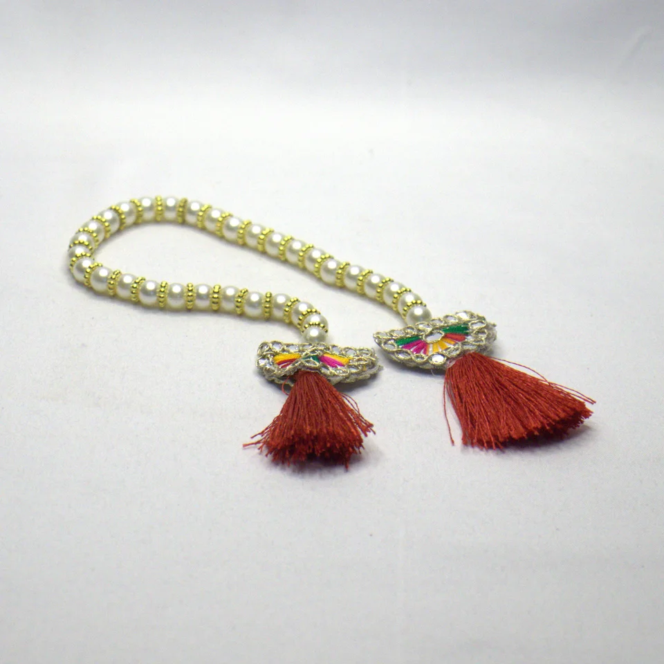 The patka features pearl beading along its length with gold-toned finish that complements the zari work on the dress. The beading catches light and creates movement when the idol is placed in a breeze or during aarti.