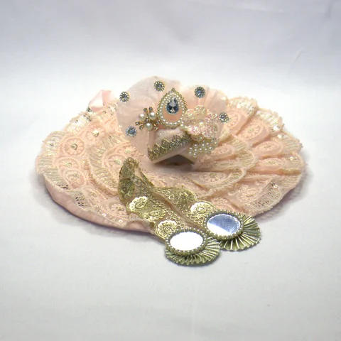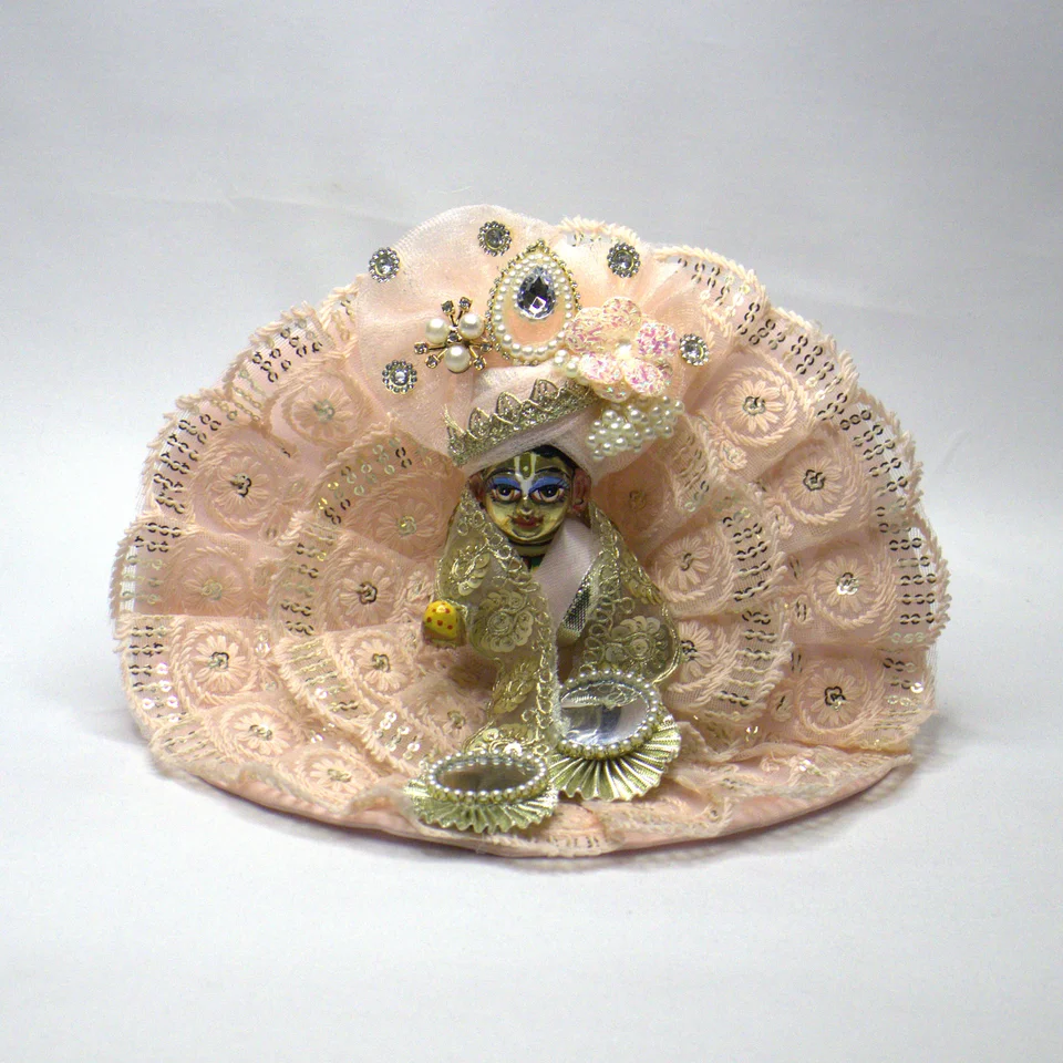 Together, the peach, pearl, and golden tones create a cohesive colour story. The rhinestone chain catches every flicker of temple light, while the pearl latkan adds gentle movement. This is a shringar that feels complete: soft in colour, rich in detail, and designed to honour Laddu Gopal with beauty and care.
