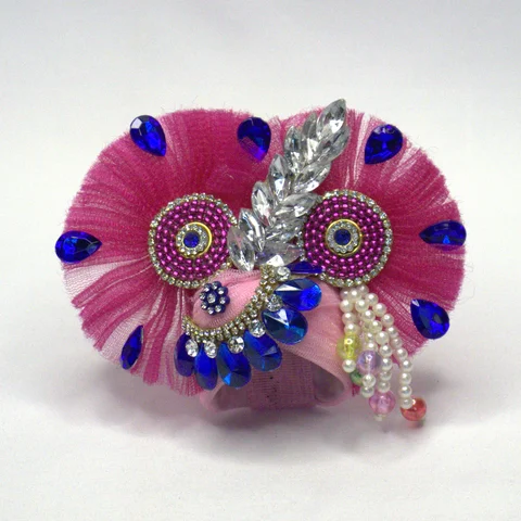 The delicate pink net base catches light beautifully, making the royal blue rhinestone chain along the border truly shine.