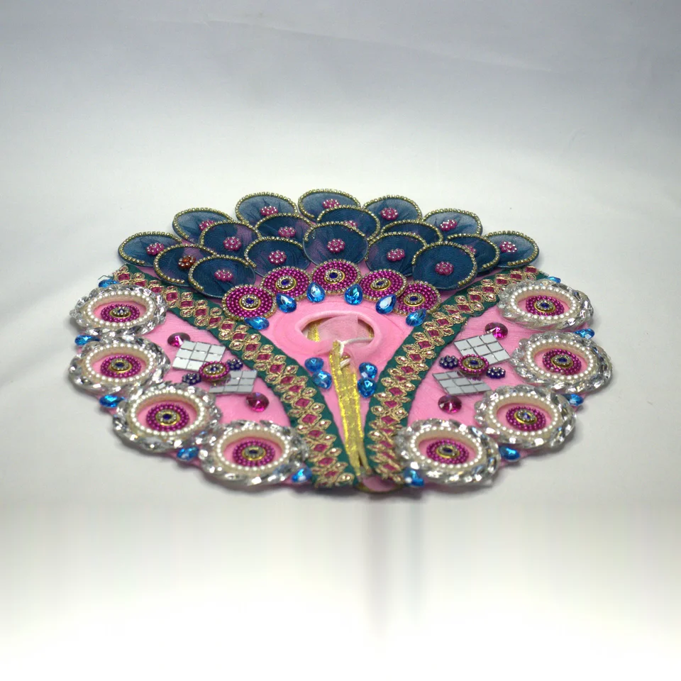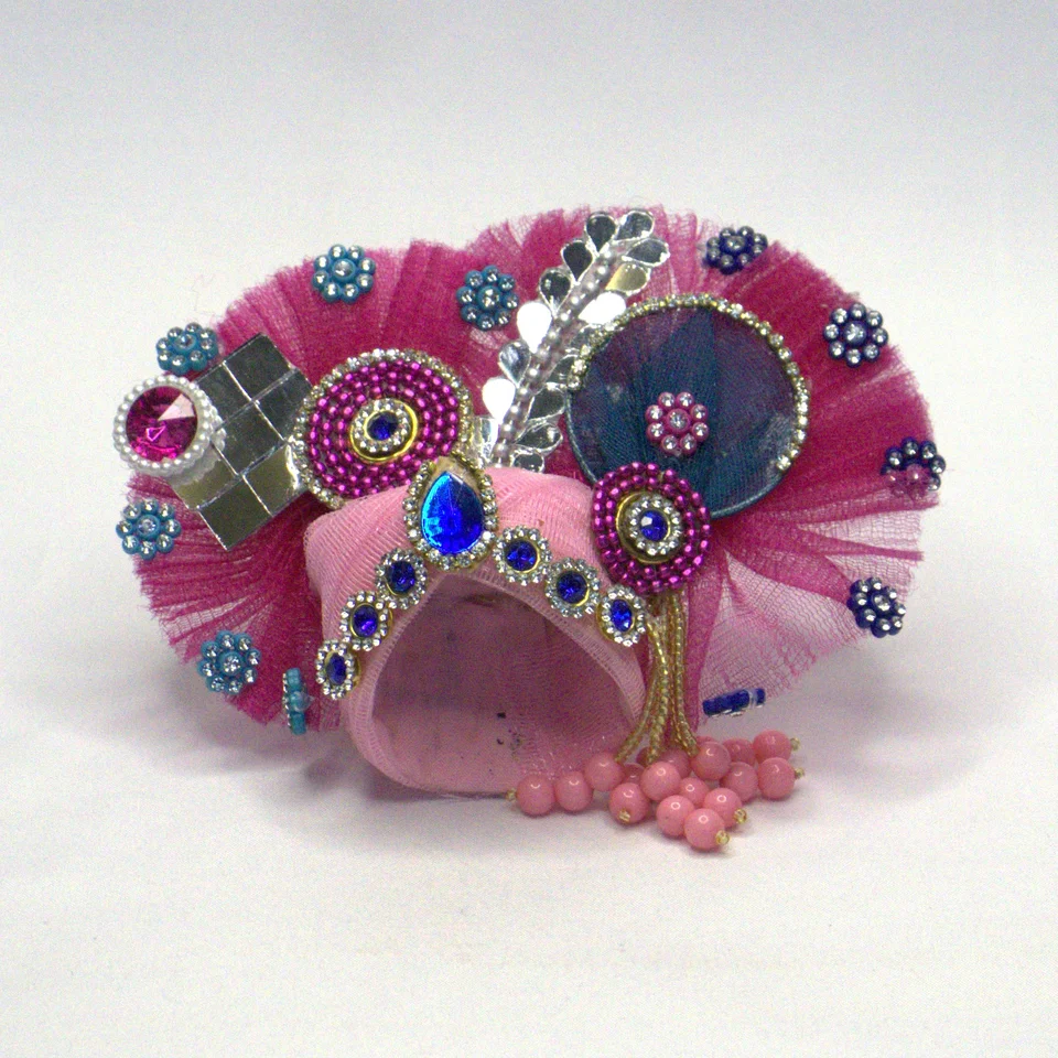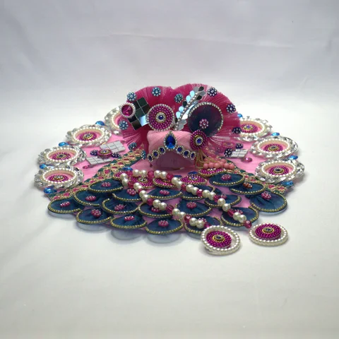The pink net base creates an ethereal, luminous quality that catches light beautifully on Thakurji. Peacock green ring butties frame the fabric, each one set with rhinestone chain and polished buttons that add sharp glints of sparkle. Vibrant pink ball chain butties run alongside, their zarkan chain and buttons creating a secondary rhythm of shimmer against the green. The border features pearl rings at center stage, each ring holding a vibrant pink butti that pops against the neutral pearl. Square mirror butties scattered throughout reflect surrounding light, while blue and pink stones add flashes of colour. The mukut in baby pink and vibrant pink mirrors the dress palette exactly. Ring butties, mirror butties, and vibrant pink butties carry the same embellishment vocabulary from dress to crown. Blue stone buttons and pink latkan tassels add movement and a finishing flourish. The pearl patka in white and pink completes the set with pearl rings and ball chain butties centered in each pearl ring. The pearl and pink coordination ties the entire shringar together, making this a complete and cohesive divine adornment set.