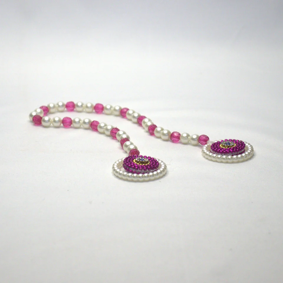 Baby pink and vibrant pink mukut with ring butties, mirror butties, blue stone buttons, and pink latkan tassels.