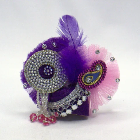 Mukut with silver ball chain butti, paisley embellishments, purple feather and white pearl tassels.