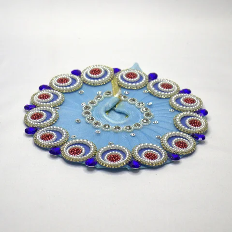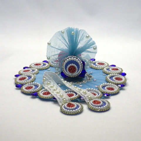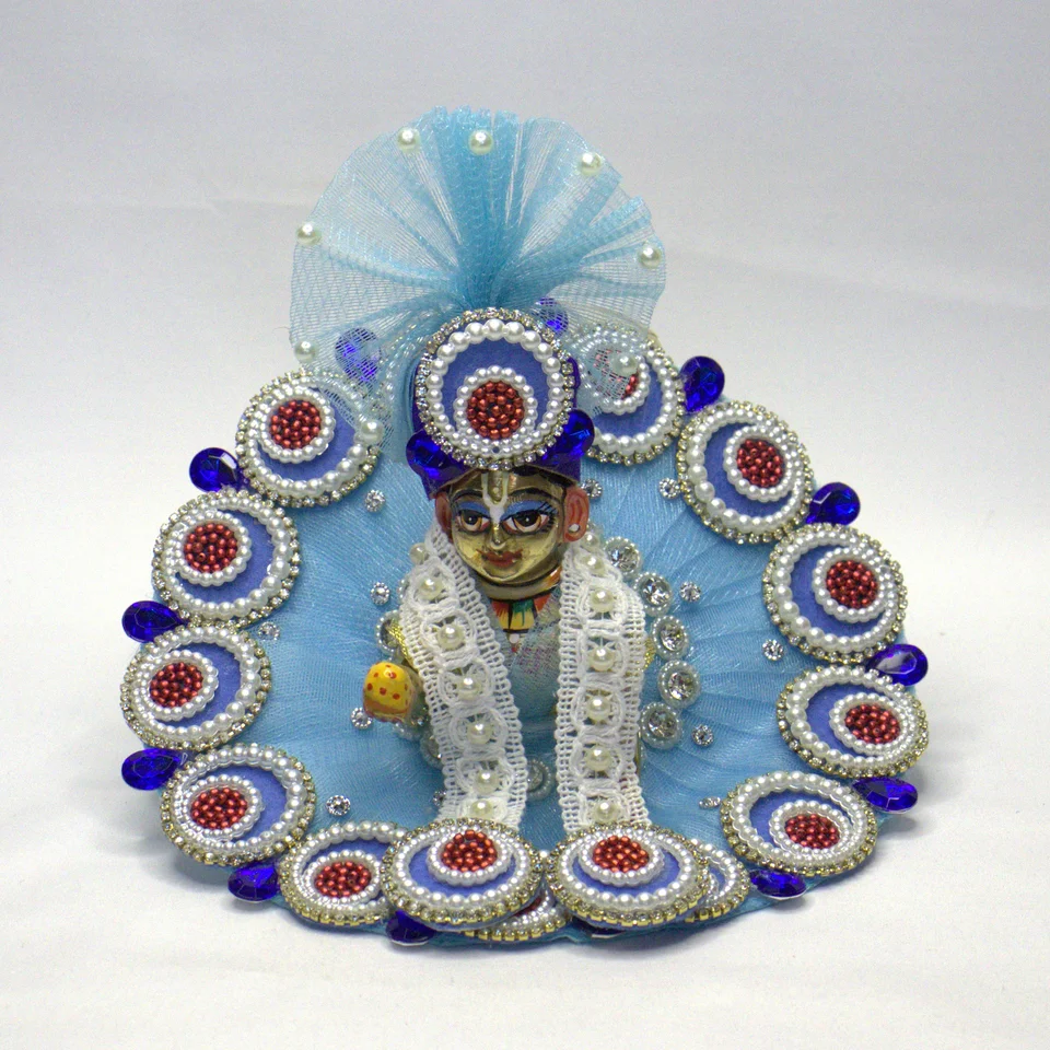 The mukut coordinates with the dress in the same sky blue tone, creating a unified look for your Thakurji. Together, the dress and mukut form a complete shringar set.